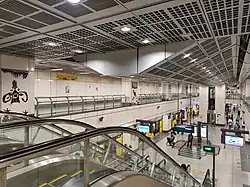 The station has six exits, with bus stops near Exits A and B, and taxi stands near Exits A and C.[5] Designed to reflect Indian traditions,[42] the metal grills of the NEL station walls have leaf-shaped patterns which may be similar to the door patterns of Hindu prayer rooms.[43] The NEL station is designated as a Civil Defence (CD) shelter:[6][44] it is designed to accommodate around 7,500 people, withstand airstrikes and remove toxic air. Equipment essential for the operations in the CD shelter is mounted on shock absorbers to prevent damage during a bombing. When the electrical supply to the shelter is disrupted, there are backup generators to keep operations going.[45] The shelter has dedicated built-in decontamination chambers and dry toilets with collection bins that will send human waste out of the shelter.[46]