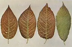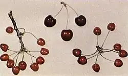 In infected trees of the commercially important cultivar Lambert, the fruit develops normally until about ten days before harvest, when maturation stops.[18] At picking time, the cherries are 1/2–2/3 of the regular size, dull in color, with an angular pointed shape.[1][18] The sugar and acid levels of the cherries are severely impacted, resulting in tasteless fruits, lacking both sweetness and flavor.[14] Other cultivars show symptoms similar to those in Lambert, but usually less severe and more varied.[1][14][18] Typically, dark-fruited cultivars show more severe fruit symptoms than cultivars with red or yellow fruit.[1][18] The ability to recover is also dependent on cultivar, with some able to return to fruit sizes and coloring comparable to uninfected trees. The taste, however, never recovers.[14]