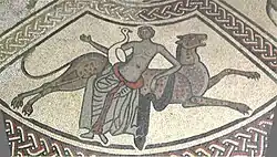 In 1727–1728 William George discovered the Orpheus mosaic whilst digging post-holes, and it was reported as "the finest pavement that the sun ever shone upon in England".[2] An engraving and drawing were made and the villa was reburied. Its location disappeared from memory. It was rediscovered in 1976 and the mosaic fully restored by 1980.[3]
