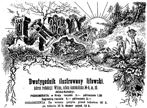 In addition to polemic articles, the newspaper published some literary works, particularly poems. Stefanija Jablonskienė (Stefania Jabłońska) published a few Lithuanian poems translated to Polish, including excerpts from The Forest of Anykščiai by Antanas Baranauskas, poems by Maironis, Adomas Jakštas, Liudas Gira.[24] She also translated Tautiška giesmė (which later became the national anthem of Lithuania) by Vincas Kudirka. It was the first translation of the poem into Polish, and it was published twice as poetic and word-by-word translations.[13]