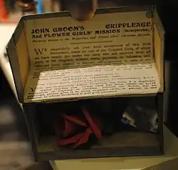 John Alfred Groom (1845–1919) was a philanthropist who founded the Watercress and Flower Girls' Christian Mission (later "John Groom's Crippleage and Flower Girls' Mission"), in 1866. In 1872 the social reformer Lord Shaftesbury established the Emily Loan Fund to enable young women flower sellers to support themselves. Later, in 1914, the Ragged School Union merged into the Shaftesbury Society, becoming fully subsumed under the title of the Shaftesbury Society in 1944.