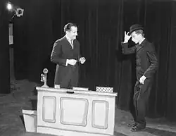 Left with no script and the pressing need to provide its performers with a play, the Unit drew up another Living Newspaper, Triple-A Plowed Under, within a matter of weeks. Morale had dropped after the cancellation of Ethiopia, and the original director of Triple-A Plowed Under left in frustration; Joseph Losey, known for his support of the Communist Party and recently returned from a visit to Moscow, replaced him.[20] Triple-A Plowed Under dramatized the plight of Dust Bowl farmers and suggested that farmers and workers unite to cut out the "middlemen"—dealers and other commercial interests.[21] The "Triple-A" in the title came from the Agricultural Adjustment Act of 1933, which the play criticized.[22] Like other Living Newspapers to follow, it employed the Voice of the Living Newspaper, a disembodied voice that commented on and narrated the action; shadows; image projections; elaborate sound design, with sound effects and music; abrupt blackouts and scene changes; and other non-realistic devices to keep the audience's attention and support the message of the play.