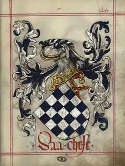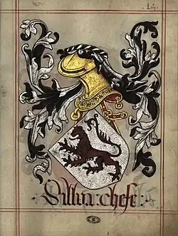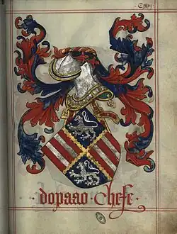 Several models of mantlings have been identified in the work, and seven models of mantling, three of which adorn 190 of the arms, and the remaining four only 24.[6] As for the helmets that top the shields, there seem to be no criteria, in the case of noble Houses, regarding the use of gold helmets (34 cases) and silver helmets. "...only one explanation remains. The illuminator did not respect any rule in choosing the metals or colors and the shape of the elements outside the shield. The choices were based solely on artistic criteria, due to the inspiration and creativity of the artist."[7] As the same author mentions, this was relatively common in armorials of the time.