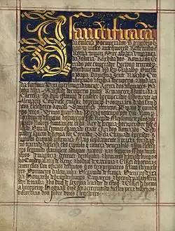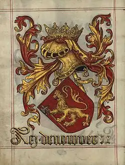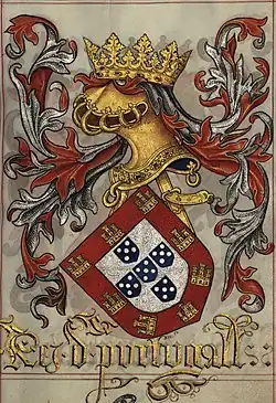 The Livro do Armeiro-Mor (Portuguese pronunciation: [li.vɾu du ɐɾˈmɐj.ɾu mɔɾ], Book of the Chief Armourer) is an illuminated manuscript dating back to 1509, during the reign of King Manuel I of Portugal. The codex is an armorial, a collection of heraldic arms, authored by the King of Arms João do Cró. It is considered one of the masterpieces of illuminated manuscripts preserved in Portugal, alongside, for example, the Apocalypse of Lorvão, from the 12th century, the Book of Hours of King Duarte, or the contemporary Bible of the Jerónimos Monastery and Book of Hours of Manuel I, also produced for the Venturoso. Being the oldest surviving Portuguese armorial to this day, being the oldest source we have regarding certain arms, and also for the beauty of its magnificent illuminations, it is considered the most important Portuguese armorial. It has been called the "supreme monument of what we can call Portuguese heraldic culture."[1]