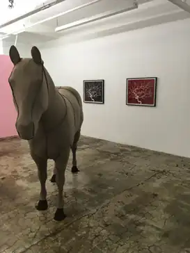 During a 1998 residency at the Ucross Foundation[44]—a working ranch—Young began incorporating images of nature, displacing some of her characteristic themes, such as the fragility and pathos of human experience onto animals and plants.[4][18] In a 2001 Skirball Cultural Center show of COLA Fellowship winners, her installation combined life-size models of farm animals covered with flesh-like material rather than fur, and a business suit and nurse's uniform fabricated from skin-like industrial bags; Los Angeles Times critic Holly Myers described them as "simultaneously vague and uncomfortably visceral."[31][7][20] Going forward, her work would also draw on the themes, landscape and literature of the American West, images of Americana, and processes such as taxidermy, embroidery and other handicrafts.[4][45][46]