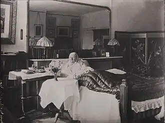 On 19 November 2008 a rare black-and-white photograph of Florence Nightingale taken in 1910 by Lizzie Caswall Smith was auctioned by Dreweatts auction house in Newbury, Berkshire, England, for £5,500.[4] On the back of the photograph Caswall Smith had noted in pencil "Florence Nightingale taken just before she died, House nr Park Lane (London). The only photograph I ever took out of studio – I shall never forget the experience."[5][6]