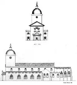 John Wood's plan to complete his work at Llandaff Cathedral. The eastern portion of the building, seen at right, is where Wood actually did work. The western portion, at left, is the porch and tower Wood proposed but never constructed.
