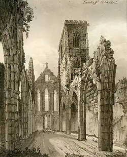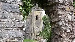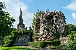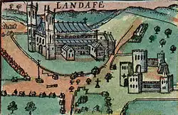 5. ^ The 1719 Browne Willis account described the Bishop's Palace as being southeast of the cathedral and as a very stately building, judged from the gate house, which was still standing in its entirety in 1719. The site of the Bishop's Palace itself was a garden in 1719.[27] There was also an Archdeaconal Castle for the Archdeacon of Llandaff on the cathedral property; it was destroyed at the same time as the Bishop's Palace.[28] Another account says the Bishop's Palace and the Archdeacon's Castle were both burned to the ground.[29]