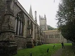 T. H. Wyatt was hired to restore the Lady Chapel in 1841, but due to other commitments later left much of the work to John Prichard, who worked the most extensively on the church in the 1840s and 1850s. Prichard had restored the sanctuary by 1850, and by 1852 he had begun to work on the nave, largely demolishing the temple Wood had built.[96] Together with London-based John Pollard Seddon, who was able to hire pre-Raphaelite artists Dante Gabriel Rossetti and Thomas Woolner, extensive developments were made. Morris & Co. provided the stained glass in the 1860s. Prichard was responsible for a dramatic redevelopment of the southwest tower in 1867–1869, aided by a number of talented artists and craftsmen.[96]