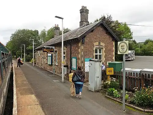 The main buildings on the northbound platform still stand and whilst the station is now unstaffed (tickets must be bought on the train), a waiting room is not available within this building, a shelter near the main building is available. The main building is now run by Llanwrtyd Wells Community Transport (LWCT), who use it as a community centre and meeting rooms. A public phone and customer help point is available on this side, whilst the southbound platform has a waiting shelter only. Digital information screens and timetable posters provide train running details. Step-free access is available to both platforms, though the southbound one requires the use of a steeply inclined ramp.[4]
