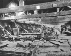 In 1932 a Blondin aerial ropeway was installed at Llechwedd and three years later a major new mill was built. Work at the quarry continued during World War II with production increasing temporarily after the conflict. In 1957, Llechwedd started shipping out finished slates by lorry to the wharves at the LMS station at Blaenau Ffestiniog, though this practice only lasted until 1962.[1]