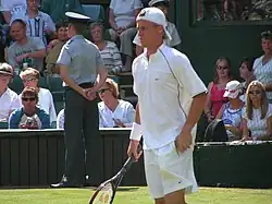 2003 was a relatively disappointing season for Hewitt as he lost the World No. 1 ranking after spending seventy-five consecutive weeks at the top spot and ended his Wimbledon title defence with a first round loss to Ivo Karlović , thus becoming the first player since Manuel Santana in 1967 to fail to defend their title by losing in the first round of the event.[ 1] However, he successfully defended his title at the Pacific Life Open (becoming the first player to do so since Michael Chang from 1997–1998),[ 15] reached his fourth consecutive quarterfinal at the US Open (losing to eventual runner-up, Juan Carlos Ferrero in four sets)[ 16] and led Australia to victory in the Davis Cup [ 17] (defeating Roger Federer in a memorable five set match en route).[ 18]