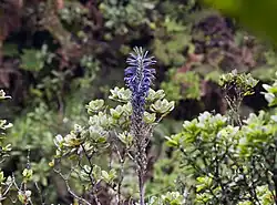 Lobelia hypoleuca is a shrub that can attain a height of 3.3 m (11 feet). Stems are woody, whitish, with a rough texture. Leaves are narrowly lanceolate with teeth along the margins, up to 60 cm (2 feet) long, green and shiny above, but appearing white on the underside due to a dense covering of fine wooly hairs (hence the epithet "hypoleuca" meaning "white below"). The plant produces 3-7 tall flowering stalks, each up to 40 cm (16 inches)long. Flowers are blue.[4][5][6]