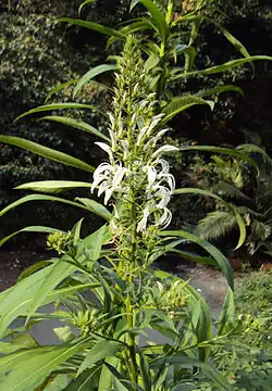 Lobelia nicotianifolia is a species of flowering plant with a distribution primarily across India and Sri Lanka. It is commonly called wild tobacco, because the leaves resemble tobacco leaves. It is a poisonous plant.