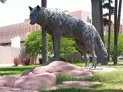 There are several statues of Lobos on the UNM campus. The most prominent, sculpted by John Tatschl, stands atop a pedestal located near the entrance to campus at Stanford and Central and is dedicated to the UNM students and alumni who gave their lives in World War II.[8] This statue was formerly located in front of Zimmerman Field. Another statue, sculpted by Michelle Middleton, is located in a grove of pine trees overlooking the intersection of Central and University at the southwest corner of campus. A statue of a Lobo head emerging out of the ground is located in front of Hodgin Hall. A number of further Lobo sculptures have been sponsored recently by donors for placement in various other locations, including in front of the President's House, Zimmerman Library, and at The Pit.[9]