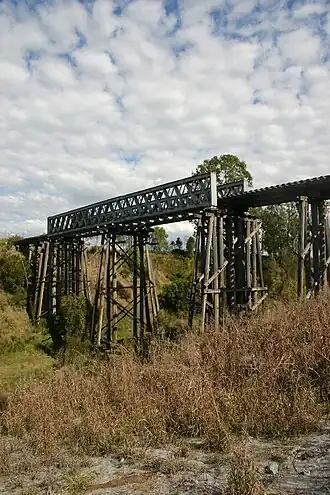 In 1968 in preparation for the operation of 60-long-ton (61 t) diesel engine locomotives in both single and multiple operation, the longitudinal members were strengthened by the addition of 6-by-3-inch (152 mm × 76 mm) channels along each side and 9-by-5-inch (230 mm × 130 mm) transoms laid over the top. The timber piers supporting the 100-foot (30 m) span were provided with concrete bases. The railway closed for traffic in March 1993.[1]
