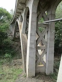The spandrel columns are arranged in pairs, one for each arch rib, with crossbracing in concrete. The arch ribs are parabolic of rectangular section. There is a concrete balustrade. The whole structure is in cast-in-situ concrete.[1]