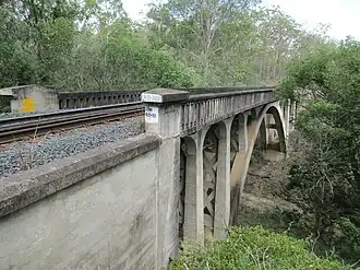 The Lockyer Creek Railway Bridge spans a dry gully on the eastern bank of Lockyer Creek, 1 kilometre (0.62 mi) south south east of Lockyer. It is a concrete arch bridge aligned on a 12 chains (790 ft; 240 m) curve and carrying a single track on a ballasted deck. Its spans are:[1]