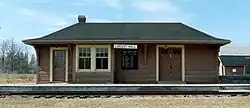 Locust Hill was one of the busiest stations on the Toronto-Perth line and was built on the St Clair Farm owned by Captain William Button on the northwest side of Highway 7.[2] Flour, brushes, livestock and milk were shipped out of Locust Hill in quantity. In 1887 an elevator and mill were built east of the station, a water tower on the west side,[3] and a co-operative creamery was built on the south side of Highway 7 on the east bank of the Rouge River in 1893, which burned down in 1910.[4] The original Van Horne style[5] one and half storey station burned down in 1935 and was replaced by a single floor station in 1936. Rail service through Locust Hill ceased in 1969, but the line is still active. The old Locust Hill Station has been relocated in 1983[3] and reconstructed at the Markham Museum and Historic Village and the station platform was removed and replaced with a grass strip.