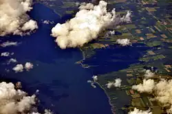 Aerial view of Lodi Point State Park and environs from south by southwest, 2013. Lodi Point can be seen near the center of the photo.