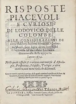 Galileo, then a professor at the University of Padua, lectured on the supernova, proposing different possible ways it could have been produced. Galileo was cautious in his views, but did regard the phenomenon as new, and not as a permanent star.[8] A few months after delle Colombe's book appeared, a response to his ideas was published under the title of Considerations of Alimberto Mauri on Some Passages in the Discourse of Lodovico delle Colombe.[note 2] Alimberto Mauri was a pseudonym and delle Colombe (like most scholars since) believed that the author was Galileo. The book ridiculed many of delle Colombe's views about the star, and belittled him as 'nostro colombo' ('our pigeon').[10] It asserted that astronomy had no need of Aristotelian philosophy, and should focus on observation and mathematics. The approach of first seeing something in the sky and then developing an elaborate explanation to make that observation fit with Aristotelian cosmology was directly challenged.[11] Delle Colombe himself then responded to 'Mauri' by publishing Risposte piacevoli e curiose (Pleasant and curious replies) in 1608.[note 3][2] In this text delle Colombe not only attacked the ideas of Copernicus, but associated them with Galileo by name.[1]