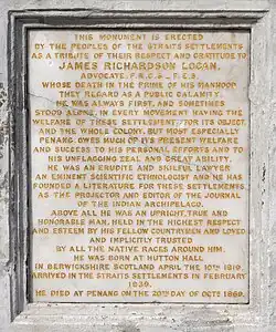 "This monument is erected by the peoples of the Straits Settlements as a tribute to their respect and gratitude to James Richardson Logan Advocate. F.R.C.S - F.E.S. whose death in the prime of his manhood they regard as a public calamity."[2]