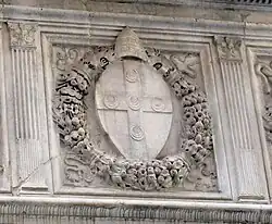 Coat of arms of Pius II with 5 crescents on cross surmounted by tiara.