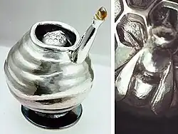 Sterling silver, raised, chased, repousséed, fabricated. A golden quartz cabuchon is set into the handle of the stirrer.[11]