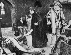 In late 1913, Weber and Smalley made The Jew's Christmas, a three-reel silent film that dramatizes the conflict between traditional Jewish values and American customs and values,[99] illustrating the challenges of cultural assimilation, especially the generational conflict over interfaith marriage and the second generation's abandonment of the faith and customs of their ancestors.[100] In "the earliest portrayal of a rabbi in an American film",[101] The Jew's Christmas told the story of an orthodox rabbi (Smalley) who ostracizes his daughter (Weber) for marrying a gentile, but is reconciled twelve years later on Christmas Eve when he meets an impoverished small child, who turns out to be his granddaughter.[102] Endeavoring to combat racial discrimination and antisemitism, the film aims to show that love is stronger than any religious ties,[103] and that "the tie of blood overbears the pride and prejudice of religion".[104][105] In its assertion of "Melting-pot idealism" by its approval of intermarriage between people of different religions,[106] the film was considered controversial at the time of its release[104][107] on December 18, 1913.[13]