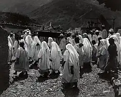 One of her most iconic images, and a personal favorite of Álvarez's, was Entierro de Yalalag (Burial at Yalalag), created in 1946.[80][81] The photograph captures a funeral procession in which Zapotec women in traditional dress somberly accompany a coffin. Their faces are obscured, their heads are covered with scarves, and they humbly gaze toward their feet, separated from the queue of male mourners, bordering the group of women.[82] The care with which the composition was made, contrasting the white flowing garments against the dark landscape and coffin, establishes a "rhythmic, lyrical pattern, creating an otherworldly effect".[83] Demonstrating both her respect for indigenous culture[80] and desire to document Mexican rituals,[84] Álvarez also captured a deeper social meaning in the photograph. The lack of individual identity for the women and their seeming anonymity, represents the societal constraints upon them and their perceived interchangeability.[85]