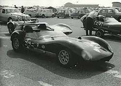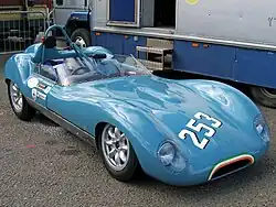 The Lola Mk1 is the first sports racing car made by Lola, under the leadership and guidance of Eric Broadley, in 1958. The body was designed and developed by chief stylist Maurice Gomm, made out of a steel or fiberglass tubular spaceframe chassis, covered in a low-profile, sleek, aluminum skin. The 80 hp (60 kW), 1,098 cc (67.0 cu in), Coventry Climax FWA four-cylinder engine was designed by Harry Mundy and Walter Hassan. The car used a 4-speed manual transmission, and was lightweight, weighing in at a mere 812–840 lb (368–381 kg). It also notably won its class at the 1960 12 Hours of Sebring, being driven by Charles Vögele and Peter Ashdown. At least 32 cars were known to have been built, but the actual number is believed to be between 38 and 42.[1][2][3][4][5][6][7]