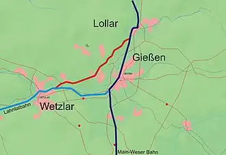 The 18.04 km long Lollar–Wetzlar line was built as a bypass for Gießen. The line separated in Lollar from the Main-Weser Railway coming from the north and ran directly to Wetzlar, where the Cannons Railway continued over the Lahntal railway to the west. This work was built under the leadership of Julius Lehwald.