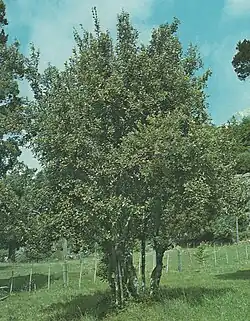 The leaves are alternate, ovate, heart-shaped base, the petioles are about 2–3 cm long, the leaves are 5-20 long and 4–12 cm wide, toothed edge, dark glossy green above and dull below, the nervation is distinct underneath.