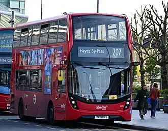Route 207 was extended from Shepherd's Bush Green to White City bus station when Westfield London opened in November 2008.[8][9] A month earlier, passengers' organisation London TravelWatch had claimed that the route carried more passengers than any other route in Europe, although this was disputed by some commentators.[10] In 2009 it was announced by new Mayor of London Boris Johnson that articulated buses would be replaced by the end of 2011; it was initially expected that the 207 would be converted to rigid single-deck operation.[7]