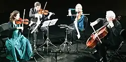 The LCE's director Madeleine Mitchell won a Royal Philharmonic Society Enterprise Award in 2022 for her creative project linking art and music in film, including her Anglo-Russian LCE String Quartet introduced concert programme with the V&A exhibition Fabergé: Romance to Revolution,[24] returning to the V&A for a sold-out concert during the Chanel exhibition, 2023. The quartet recorded a work by Effy Efthimiou in 2022.[25] They opened Kensington & Chelsea Music Society 2022/23 season in the newly refurbished Leighton House with Quartet no.5 by Joseph Horovitz (in tribute to the composer who died in 2022) and Brahms Clarinet Quintet.[26] In 2023 they gave the premiere of the newly discovered original version of Herbert Howells String Quartet no.3 In Gloucestershire with Schubert String Quintet for the Schubert Society of Great Britain[27]