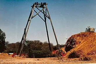 The headframe, straddling the mine shaft entrance, is a tall hardwood structure consisting of four inwardly-slanting legs connected at their apex by timber beams which once supported a pulley servicing one of the two compartments in the shaft. The structure has cross bracing to each side at the top, with some remains of cross bracing at mid level.[1]