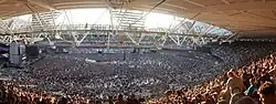 During the Games, the Stadium's grandstands contained a lighting system developed by Tait Technologies that allowed them to function as a giant video screen, later called Landscape video.[85] 70,500 individual "paddles" containing nine LED pixels each were installed between each seat, which were controlled via a central system to display video content wrapped around the stadium.[86] The Stadium took a Guinness World Record for the Largest landscape video display, during the opening ceremony with 634,500 sources of light.[87][88] This technology was also adopted for the Pyeongchang Olympic Stadium, which hosted the 2018 Winter Olympics.