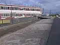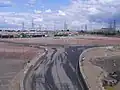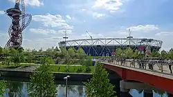 The stadium site is on former industrial land between the River Lea (which rejoins the Navigation below Old Ford Lock), the City Mill River, and the Old Pudding Mill River, parts of the Bow Back Rivers.[52] Another branch of this system, St Thomas' Creek, 200 metres (660 feet) to the south, completes an "island" surrounded by water.[53][54] 200 metres (660 feet) to the east is the Waterworks River; with the London Aquatics Centre on its eastern bank. This "island" site for the stadium lies at the southern end of the Olympic Park.[53] To make room for its construction, the already partially obstructed Pudding Mill River, a short channel of the Lea that ran from the west side of the stadium south-eastwards across the site, was filled in.[55] A number of businesses were required to move for the stadium and park. During the bidding for the 2012 Olympics a group of businesses in Marshgate Lane, where the stadium was to be built, wrote to the IOC to withdraw their support for the plans due to unfair treatment.[56]