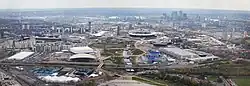 When Beijing won the 2008 Olympic Games in 2001, this left the way open, under the IOC's policies on awarding Olympic Games, for London to bid for the 2012 Games using the land earmarked in east London.[42] London Mayor Livingstone supported a bid for the games as long as it regenerated east London.[43] In 2002 Mayor Livingstone stated that the proposed site was in Stratford.[44] By then it had been decided that Wembley Stadium would be able to host athletics, as a platform for a track was built into the stadium's design; however it could not be the focal point for the Games. Clegg stated that the seating in the stadium would have to be reconfigured, and there would not be enough seats left to meet the requirements of the IOC. In addition he noted that any future bid would focus on east London.[45] In May 2003 the British government gave the go ahead for an Olympic bid.[46][47] London's bid book was submitted to the IOC in 2004 and confirmed the idea of an Olympic park and stadium in the east of the city.[48][49][50] The IOC awarded London the right to host the 2012 Olympic Games after the city won the most votes in July 2005.[51]
