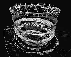 Initially, the stadium design received a mixed response from the media, with reviews ranging from "magnificent" to the derisory "bowl of blancmange".[89] The design was promoted as an example of "sustainable development", but some architecture critics have questioned both its aesthetic value and suitability as a national icon – especially when compared with Beijing National Stadium. For example, Ellis Woodman, Building Design's architecture critic, said of the design: "The principle of it being dismountable is most welcome... it demonstrates an obvious interest in establishing an economy of means and as such is the antithesis of the 2008 Olympic stadium in Beijing. But while that's an achievement, it's not an architectural achievement. In design terms what we're looking at is pretty underwhelming." He went on to criticise the procurement and design processes – stating of the latter that it should have been subject to an architectural competition.[90] This view was echoed by Tom Dyckhoff, The Times's architecture critic, who described the design as "tragically underwhelming" and commented that the "architecture of the 2008 and 2012 Olympics will, in years to come, be seen by historians as a "cunning indicator of the decline of the West and the rise of the East".[91] Piers Gough, Amanda Levete and Charles Jencks noted in the Guardian that "it's an Ikea stadium." Continuing they note that this stadium does not take your breath away. "Beijing's Bird's Nest stadium was the icon for the Olympics in China and that is what we are missing. It is not going to capture anyone's imagination and does not hold the iconography of the moment." They admired the stadium for its simplicity and economy.[92] Amanda Baillieu writing in Building Design challenged the designer's claims that the stadium is environmentally sustainable and good value for money. Instead, it is asserted that the reality will be the opposite. Noting that the roof and the seats could not be reused.[93]