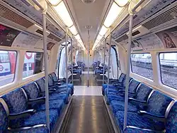 The trains were originally delivered with seats with a mauve and grey moquette. They formed the letter J for Jubilee (the Northern line's moquette formed the letter N). This was replaced in November 2005 with the new dark blue Tube Lines moquette with multi-coloured and multi-size hollow squares, introduced at the same time on the 1973 and 1995 stock. At the same time, the purple armrests were repainted blue to match the new seats.