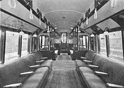 The District Railway ordered 60 × 7-car electric trains in 1903. A third of the vehicles were made in England, the rest in Belgium and France, and electrical equipment was installed on arrival at Ealing Common Works.[27]: 28 Access was by sliding doors, double doors in the centre and single doors at either end. First- and third-class accommodation was provided in open saloons with electric lighting.[27]: 28 [28]: 36 The seats were covered with rattan in third class and plush in first.[28]: 36 From 1906 the standard formation was six cars, with an equal number of motor and trailer cars[28]: 33 running in either two- or four-car formations off-peak.[38]: 44