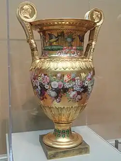 The vase is created using hard-paste porcelain.[1] Hard paste porcelain was not used at the Sèvres Manufactory until the mid-1700s when a large deposit of china clay, a vital ingredient, was found in Limoges, France.[2] The vase is considered in the Etruscan form, due to the large scrolling handles, and was known as a vase étrusque á rouleaux in royal decrees and records surrounding the object.[3] Once the vase was commissioned, various artists were brought in to decorate the lavish porcelain. The vase itself was designed by Napoleon's chief architect, Charles Percier (1764-1838). The decorations around the exterior of the vase were designed by Alexandre-Théodore Brongniart (d. 1813) and were executed by Gilbert Drouet (1785-1825) and Christophe-Ferdinand Caron (active 1792-1815).[1]