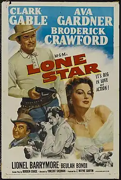 Lone Star is a 1952 American Western film starring Clark Gable, Ava Gardner, Broderick Crawford, Ed Begley, and Lionel Barrymore (in his final role) as President Andrew Jackson. The film also marks the first (uncredited) screen appearance by then-13-year-old George Hamilton, playing beside Barrymore in the role of Jackson's servant.[2]