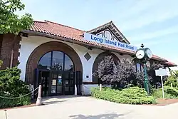 Due to repeated storm damage to rails and other equipment, the LIRR petitioned the New York State Public Service Commission to move the station 1000 feet north in January 1909, which was fully endorsed by the Estates of Long Beach who even offered to exchange land with the railroad.[9] That permission was granted in February of the same year. The present depot at Park Avenue was built in June 1909, and is larger than the previous station off the Atlantic Coast. It was designed by Kenneth M. Murchison, who also designed the 1913-built Jamaica station[10] and Hoboken Terminal. Over a year later, the station and the line were electrified. The station also included a baggage house and express freight office along track number 10.[11][12] Beginning in the early 1960s, store fronts began operating in front of the station along the street and continued to do so until the station was renovated in 1988. Another renovation in the early 2000s added a parking garage, bus depot, and platform bridge. The bus depot is on Centre Street adjacent to the station building, and the parking garage contains a section for bicycles.