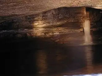 Created in limestone by the slow corrosion of slightly acidic rainwater over millions of years, the cave is split into two parts, "Lower Long Churn" and "Upper Long Churn", each active with a stream, and is connected to the nearby Alum Pot and Diccan Pot.[1] Upper Long Churn can be entered via descent of a 4-metre (13 ft) waterfall into "Dr Bannister's Handbasin", a moderately deep pool of water, and comprises a single long passage.[2] Lower Long Churn leads to an exit into Diccan Pot, followed by the "Cheesepress", a narrow squeeze which is notorious for its tightness but which can be bypassed.[3][2] The following part of the passage used to be aided by artificial aids (over the so-called "Plank Pool") but is no longer. The end of the Lower Long Churn is a chamber which opens on a window into Alum Pot, which is much more technically difficult to descend (or ascend).[2]