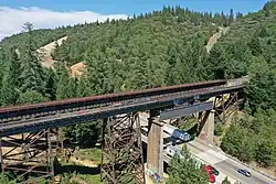 Long Ravine Trestle is a pair of deck plate girder railway bridges near Colfax, California.[1] They carry the Union Pacific Railroad Roseville Subdivision over Long Ravine and Interstate 80, traversing the Sierra Nevada. The original crossing was a three-span Howe truss bridge with wooden trestle approaches, constructed as part of the first transcontinental railroad.[2] The Nevada County Narrow Gauge Railroad was subsequently constructed under the bridge between 1875 and 1876.[3] The trestle portions of the bridge were replaced with embankments by this time.[4] The original wooden trestle was replaced with an iron structure in 1890.[5] Southern Pacific double tracked the line and constructed the two modern bridges, completed in 1912 and 1913,[6] to carry the rails. The southern span was retrofitted in the late 1958 to allow for the new U.S. Route 40 freeway to be routed underneath.[6] The bridge is predominantly used for freight trains, but is utilized by the daily Amtrak California Zephyr.