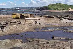 A copper mine was active at Long Reef in the 1880s,[3] after a tunnel was drilled on the southern side. A beach is formed under the cliffs and above the rock platform, with layers of shells and dark minerals. Beach sands include the minerals Ilmenite, rutile, zircon and monazite. The cliffs have evidence of ironstone and laterite, with fallen boulders of the iron rich haematite. Perched water tables produce a number of small freshwater springs on the cliff face. Evidence of faults and folding can be seen at Long Reef. The highest point of Long Reef is composed of Newport Formation sandstone which overlies the Garie Formation.[4][5]