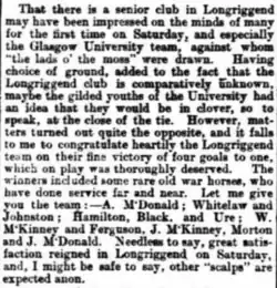 Although the club made tentative approaches to reverting to junior football in 1899,[12] it remained a senior club, and fell one round short in the Qualifying Cup of making the Scottish Cup proper. After wins over Glasgow University and East Lanarkshire in a "very hard game",[13] Longriggend lost 1–0 to Wishaw,[14] and protested in vain about the eligibility of one of its players.[15]