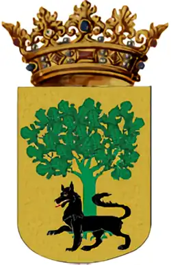 His proof of nobility from the 16th century is displayed on one hundred and sixty pages on vellum with two coats of arms. His main arms were described in Spanish as: "De oro, con un lobo de sable, al pie de un roble de sinople" (seen right).[3] It was presented on 27 April 1595, when the patriarch of New Spain, don Lope Ruiz de Esparza, appeared before the Mayor of Mexico City, Rafael de Trejo Carbajal, to present his ancestry: stating that he was the son of Lope Ruiz de Esparza and doña Ana Díaz de Eguino, both of Pamplona. The elder Lope litigated his nobility in Pamplona stating his lordship over the palaces of Esparza and Zariquiegui, having won the lawsuit by judgment dated 23 November 1535.